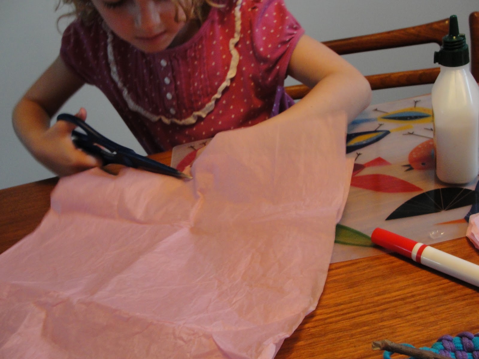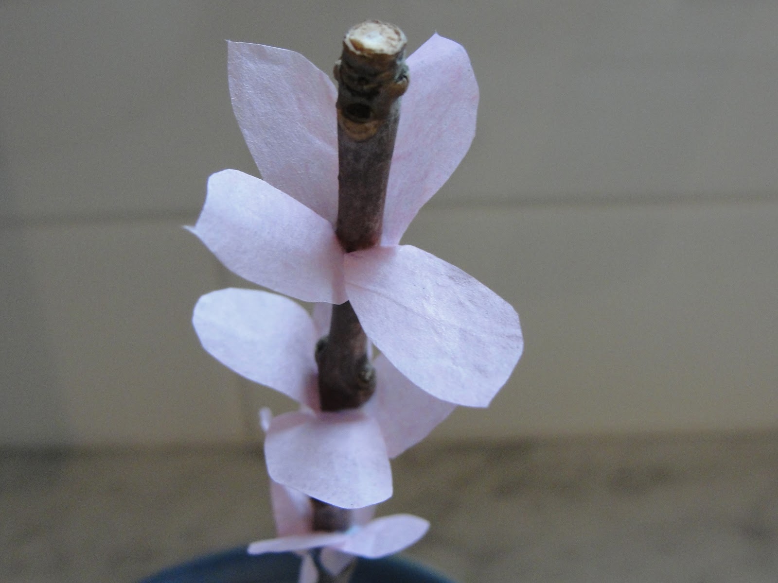 Now, I might be a little biased, but I think these poems are lovely. She really is a beautiful writer. Not to be outdone, my younger daughter, Cee, created a cherry blossom branch. She started by finding a twig in our yard and then simply cut out the cherry blossom petals from pink tissue paper. Using white glue, she stuck the petals to the branch. Cherry blossoms are a popular tree in Japan and they are the inspiration for many festivals in the springtime.