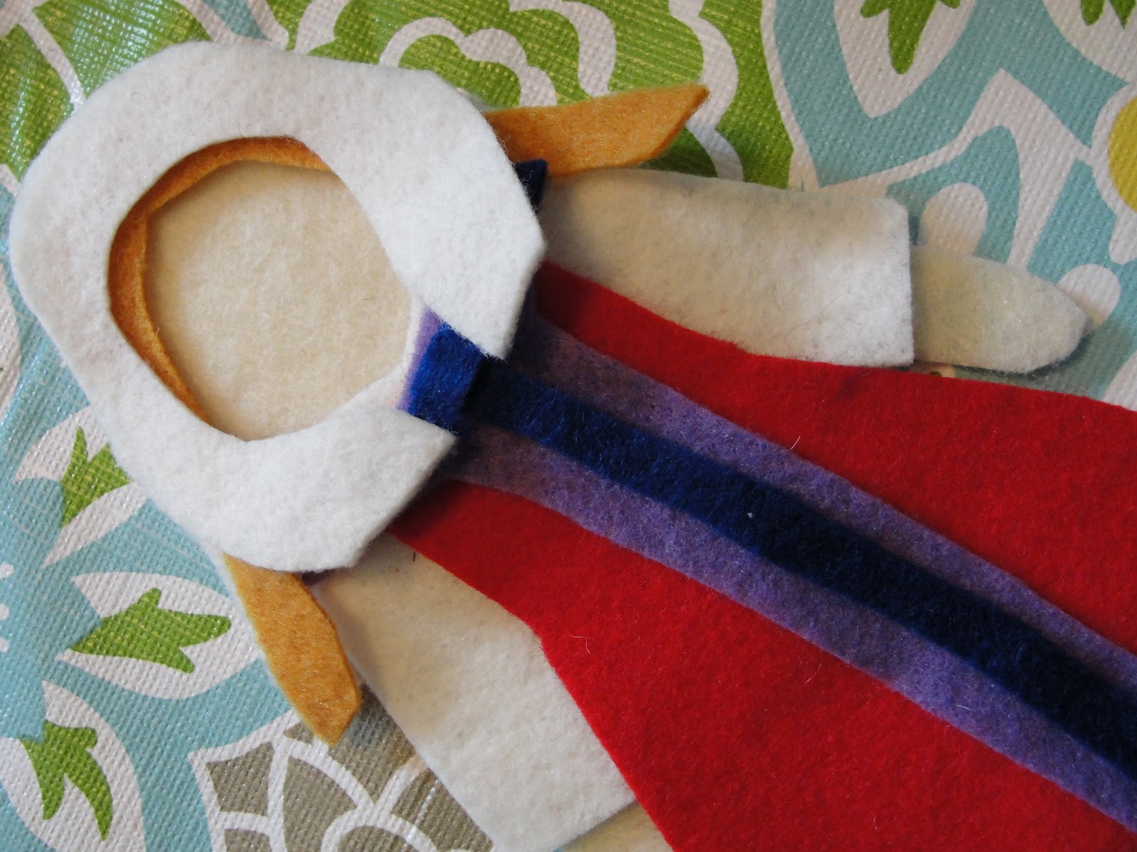 Using a paper doll body and clothing we cut out the pieces we needed to make our doll out of felt.