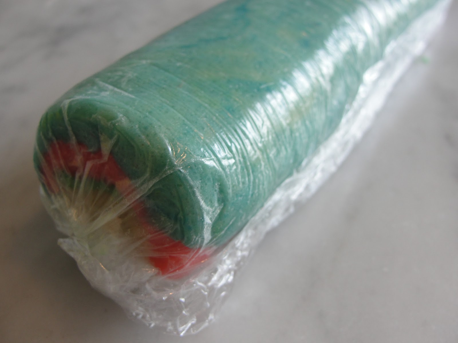 Place one portion onto a piece of plastic wrap and cover. Now shape this piece into a thin “snake”…about 6” long. Keep wrapped and set aside.