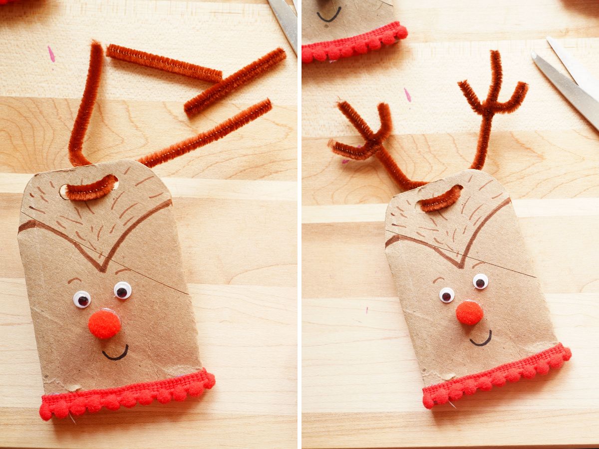 It's time to close the reindeer boxes by adding the pipe cleaner antlers. Poke the pipe cleaner through the holes, from the front to the back. Then twist the pipe cleaner on the back side of the reindeer. Trim about 1 ½ inches of pipe cleaner from each end. Then wrap the smaller pieces around the longer pieces. This will give the pipe cleaners a fun antler look. Alternatively, you could wrap the pipe cleaners around a pencil and have curly antlers.