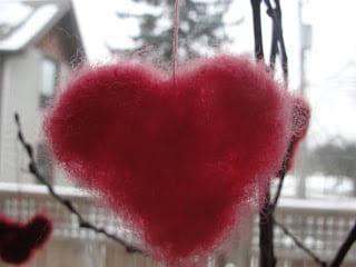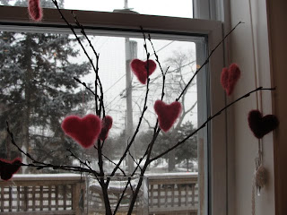 The first craft project I am working on is a Valentine's Day project. Ever heard of needle felting? Well, I had heard about it, and when a friend offered to hook me up with some wool roving I said "sure"! Not really even knowing what wool roving was. To be honest, I haven't done that much felting since getting my supplies at Romni Wools. Needle felting supplies typically include long needles with tiny barbs along their sides. These barbs work to grab the tiny fibres and mesh them with other fibres...eventually making a solid piece of fabric. You also need something to place behind the fibres, so you have something to poke the needle into...aside from your finger...which actually hurts. For Christmas, I made cute little snowmen for the kids in my life...and that's all I have done. So, Valentine's is the perfect opportunity.