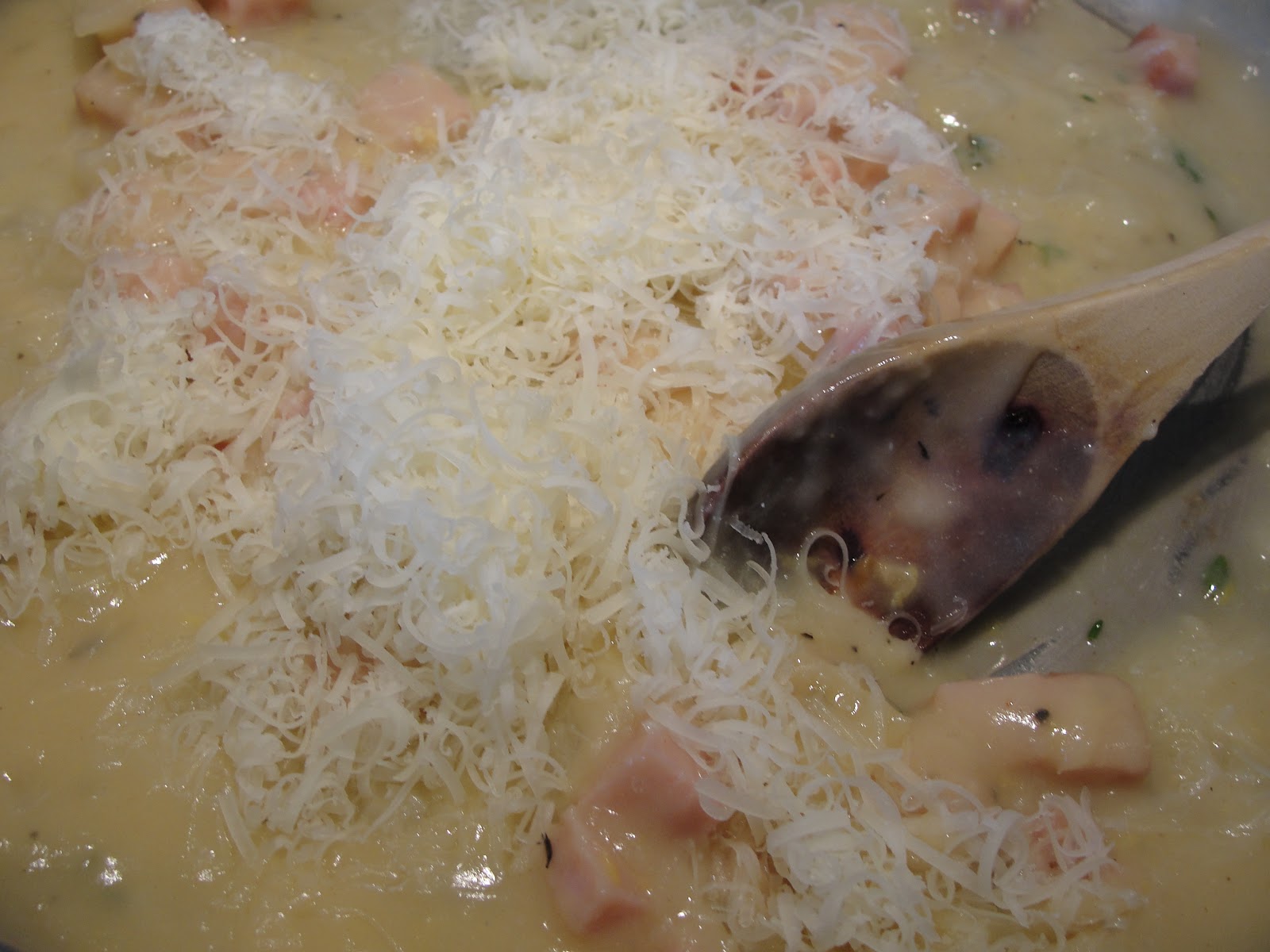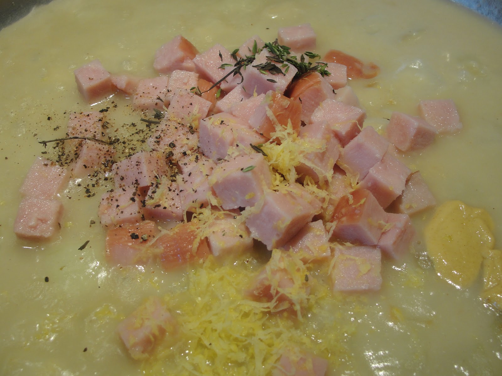 7. Reduce heat and add ham, lemon rind, mustard, thyme and pepper.