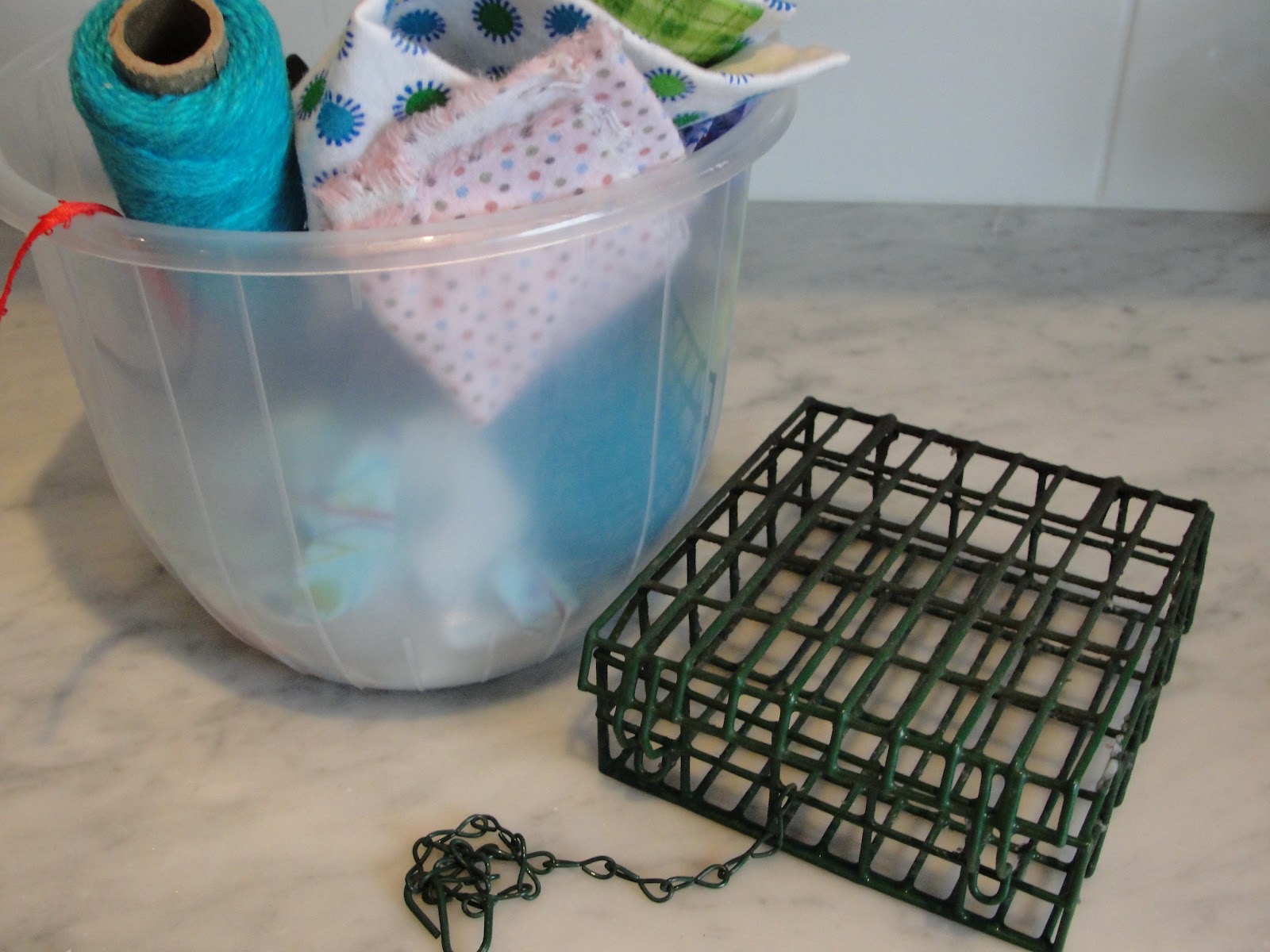 1. We reused our suet feeder cage, but you could use anything cage-like, it needs to hold the items inside but let the birds easily access the contents. We washed ours thoroughly in warm soapy water.