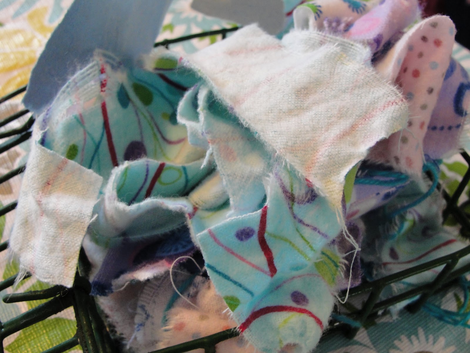 2. Rip up fabric scraps, paper scraps and string. Stuff into the suet cage.