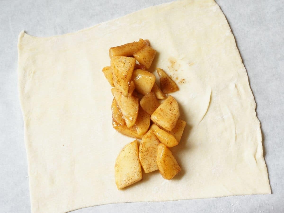 - Spoon 1-2 tbsp of apples into the centre of each square – right down the middle.