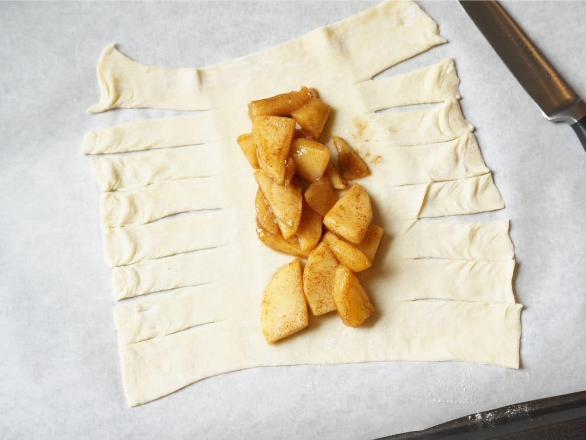 - Peel and slice the apples. Cut into slices and then halve the slices. You don't want the apples to poke a hole in the pastry.