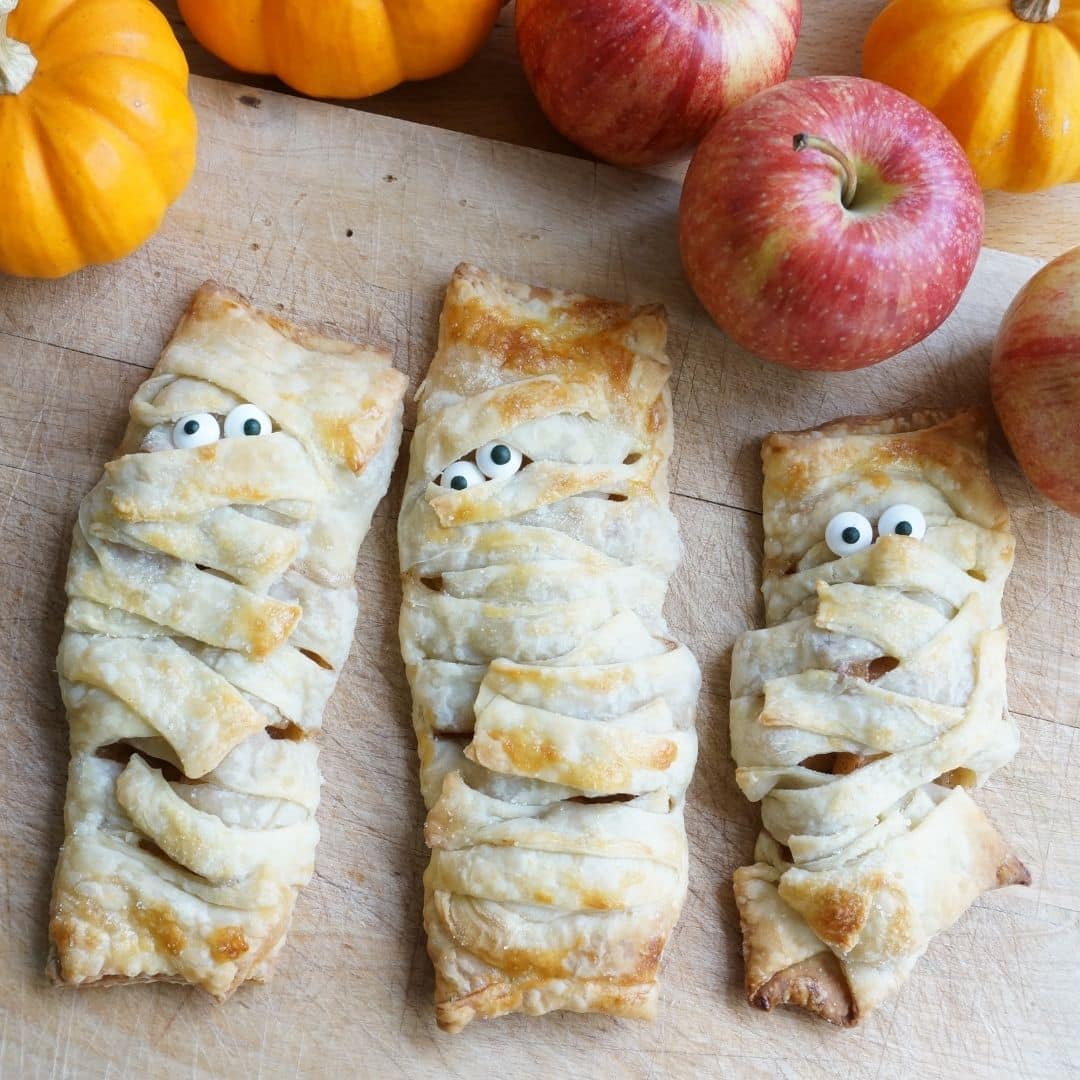 How cute are these Halloween apple turnover mummies? Yes, we love making Halloween crafts for kids – but I also love making silly Halloween snacks too. These silly apple turnover mummies are so much fun!