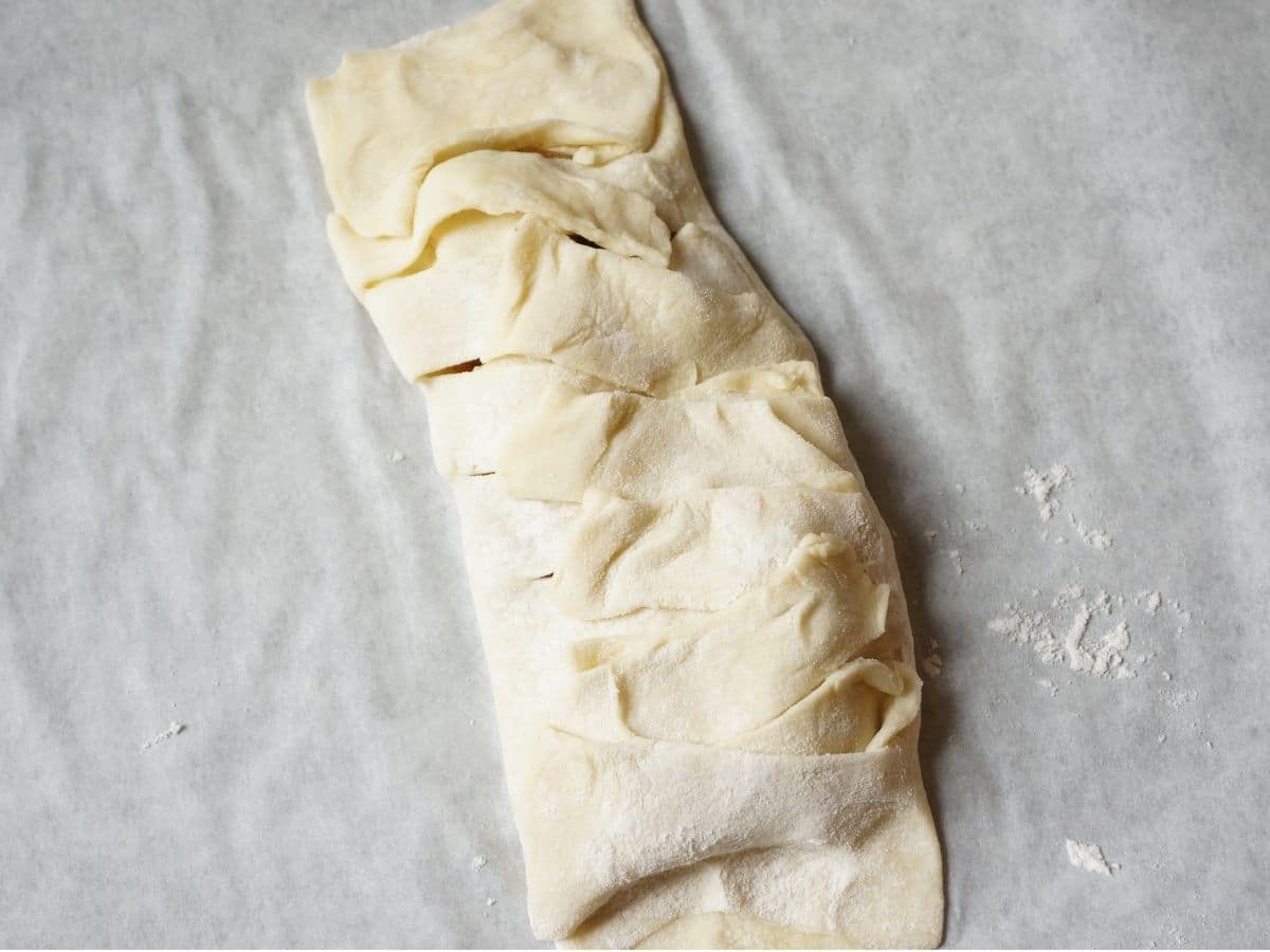 4. Roll out puff pastry on a lightly floured surface. Make a large rectangle – about 24″ x 12″.