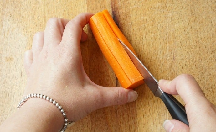 We made pumpkin-shaped carrot slices too. Use a sharp knife to cut two parallel lines down a large carrot. These lines will be on either side of the pumpkin's stem. The lines should be about ¼ inch apart. Next, cut another line about ¼ inch parallel to those first lines. This line will be the top of the pumpkin, toward the stem.