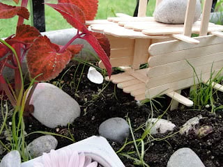 Now, the fairies needed a place to stay...a house made of popsicle sticks. My eldest daughter made the basic design and I operated the glue gun. Ta da! Modern fairy architecture!