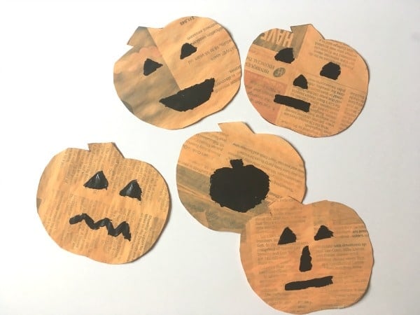 Once the newspaper is painted (both sides) and has dried use the pumpkin cookie cutter to trace pumpkins all over the paper. Our cookie cutter is about 4 inches wide. Alternately, you could use our printable pumpkin templates. There are 2 different sized pumpkin shapes and all you have to do is print them, cut them out and trace them on your painted newspaper. When the tracing is done, it's time to cut all of the pumpkins out.