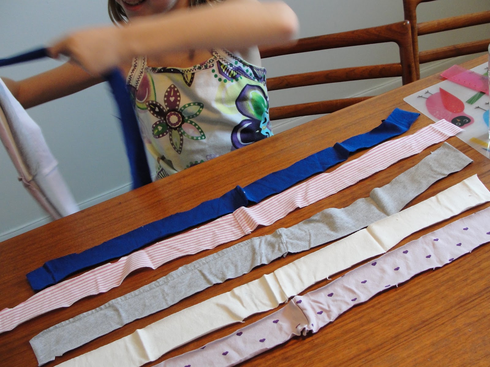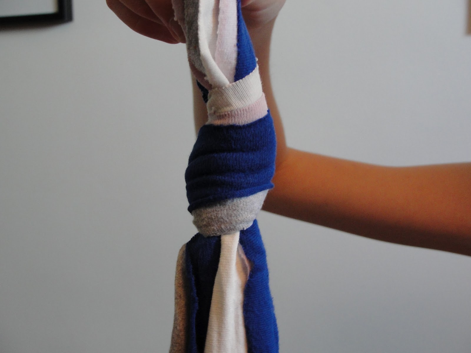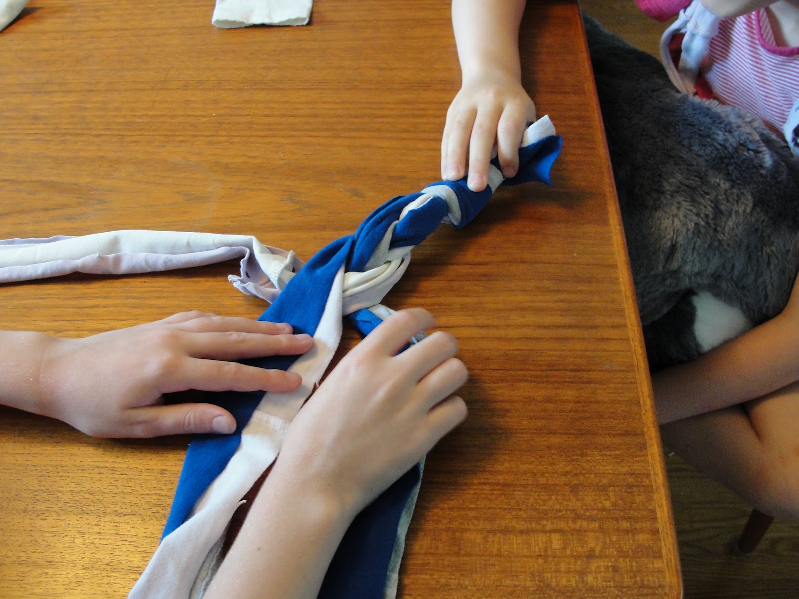 The countdown is moving full steam ahead. Only 11 days until our puppy arrives. It’s amazing how quickly the time has passed by. We started our puppy readiness planning way back in May! Our to-do list is ever growing. Although there are plenty of items on the long list, the item the girls and I couldn’t wait to check off was making our very own dog toy. We are always looking for ways to recycle and this toy fits the bill. We were inspired by this post on Pinterest. Here is how we made our very own t-shirt braid toy.