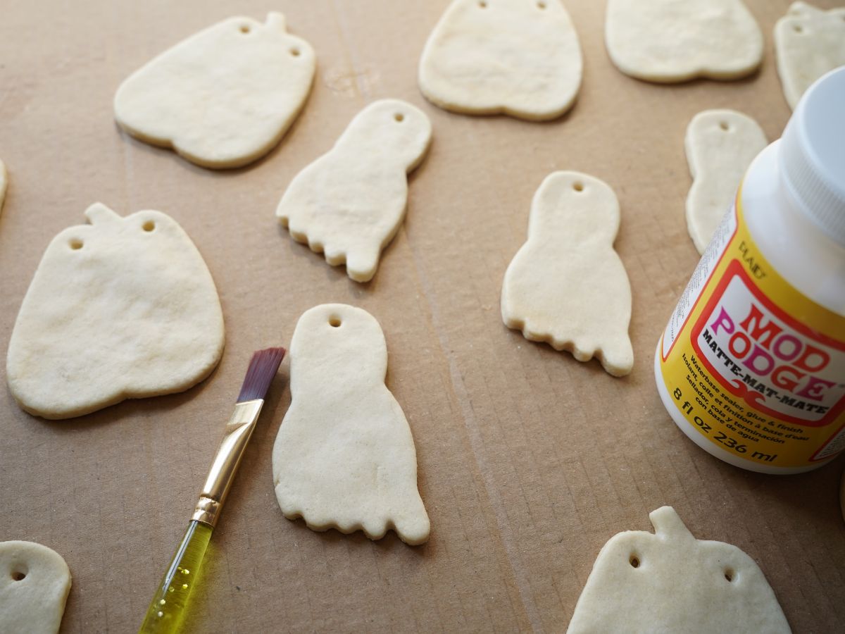Remove from the oven and allow them time to cool on a rack. Once the salt dough Halloween ornaments are cooled, it is time to paint. If there are any rough edges, use a sheet of fine sand paper to smooth the edges. Then I sealed them with a clear coat of Mod Podge, this isn't necessary but I liked having a smooth surface to paint on.