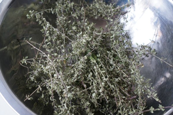 I picked up a few mason jar style spice bottles at the dollar store. After drying a huge crop of silver thyme and crunching all the leaves off the stalks, I transferred the dried herbs to the bottles.