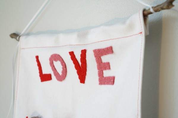 When the hearts and the word "LOVE" were sewn on, slip the stick into the channel at the top of the panel, tie a piece of ribbon to either end of the stick and and hang the calendar on a clear push pin on the wall.